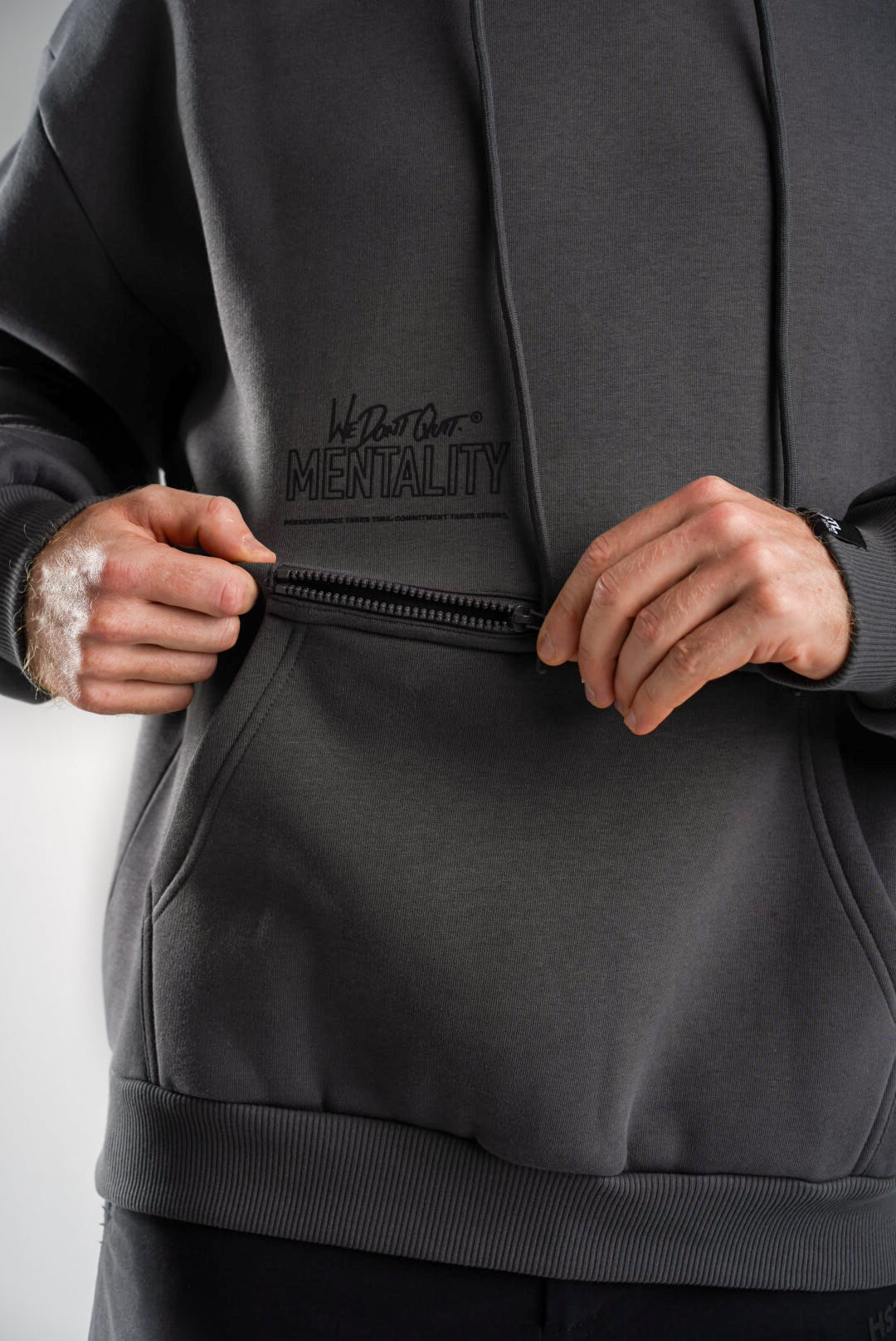 You'll be reaching for the Utility Hoodie every day. Ultimate comfort, style, and functionality collide. Featuring a paneled hood and crewneck insert detail, a zippered pocket behind the kangaroo pouch, and our "We Don't Quit" messaging to get you through the daily hustle.